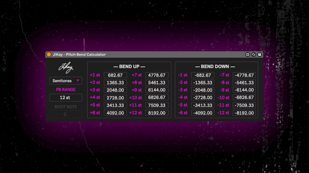 Pitch Bend Calculator is a Max For Live reference tool that displays the exact MIDI pitch bend values needed to reach specific intervals or musical notes.