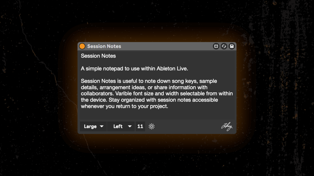 Session Notes is useful for noting down song keys, sample details, arrangement ideas, or sharing information with collaborators. Variable font size and width selectable from within the device. Stay organized with session notes accessible whenever you return to your project.